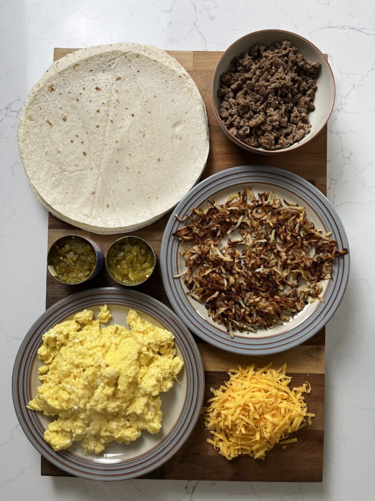 1. Lay out the tortillas and layer the filling directly onto the tortilla: scrambled eggs, turkey sausage, crispy hash browns, diced green chiles, shredded cheddar cheese